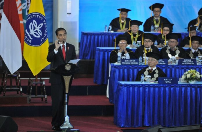 Presiden Jokowi memberikan sambutan pada menghadiri Sidang Terbuka Institut Pertanian Bogor (IPB) dalam rangka Dies Natalis Ke-54, di Graha Widya Wisuda, Kampus Dramaga Bogor, Jawa Barat, Rabu, 6 September 1017 pagi (Foto: JAY/Sekretariat Negara/ THE EDITOR)