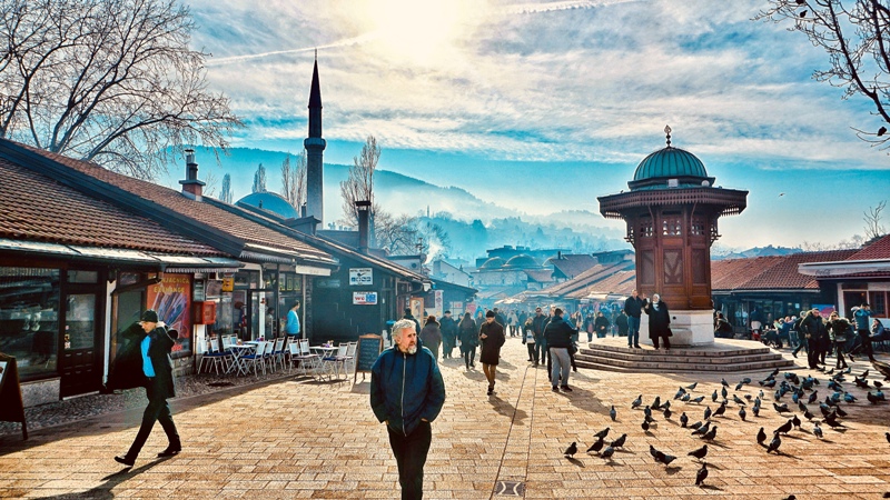 Beginilah suasana Kota Tua Sarajevo di sore hari. Dengan latar belakang menara Masjid Husrev-beg dan The Sebiljs. The Sebiljs (kanan) adalah simbol Kota Sarajevo. Air mancur yang bentuknya seperti kios ini bisa anda temukan di alun-alun kota dan bisa di minum.