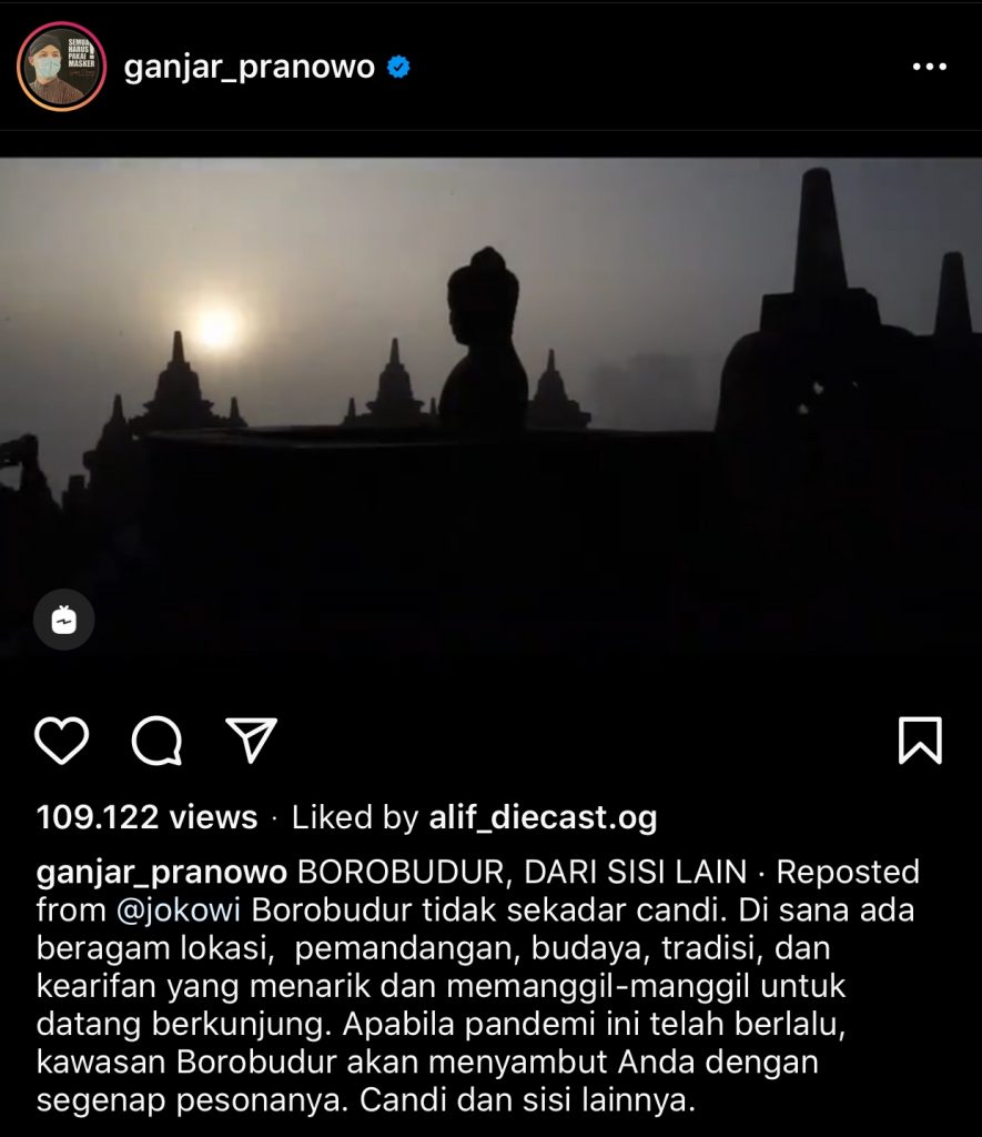 Jawabannya adalah Ganjar ternyata menyibukkan diri mempopulerkan keindahan Candi Borobudur yang diunggah oleh Presiden Joko Widodo di Instagram dua hari yang lalu. Dimana Ganjar sendiri mengunggahnya kembali di Instagram miliknya 7 jam yang lalu.